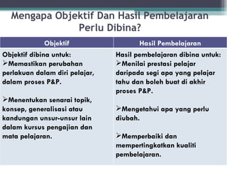 Menjelaskan maksud matlamat dan objektif pengajaran dan pembelajaran 2. Ia berbeza dengan objektif pembelajaran. Membezakan empat domain hasil pembelajaran iaitu kognitif afektif psikomotor dan sosial 3.